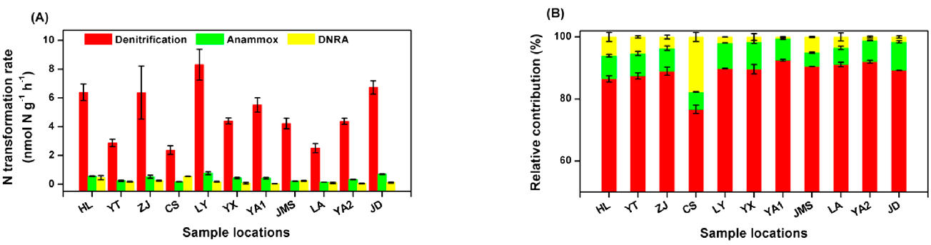 圖7 利用MIMS測量出11種中國典型稻田土壤下的反硝化、厭氧氨氧化、DNRA的貢獻率(Shan J et. al, 2016)